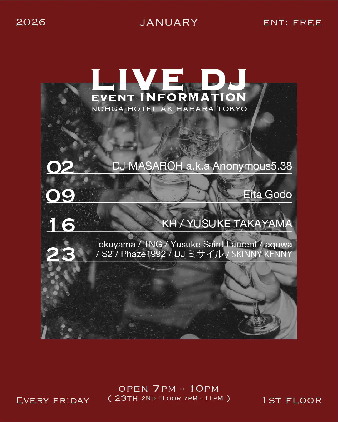NOHGA HOTEL AKIHABARA TOKYO offers lounge music selected by DJs as BGM throughout the hotel so that guests can fully enjoy the hotel's theme of “music”. The Year End Party will be held again this year to bid farewell to 2025. Join the relaxing space equipped with quality sound equipment.
